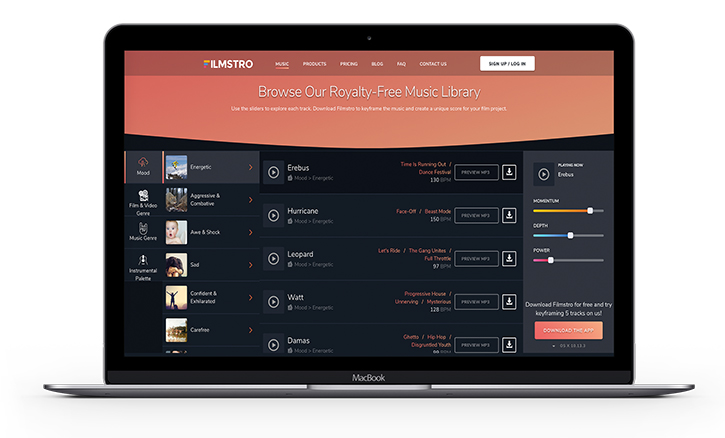 On Filmstro, these aspects become the three key controls on the user interface, which comprises a left-to-right slider and a drag-and-drop timeline.