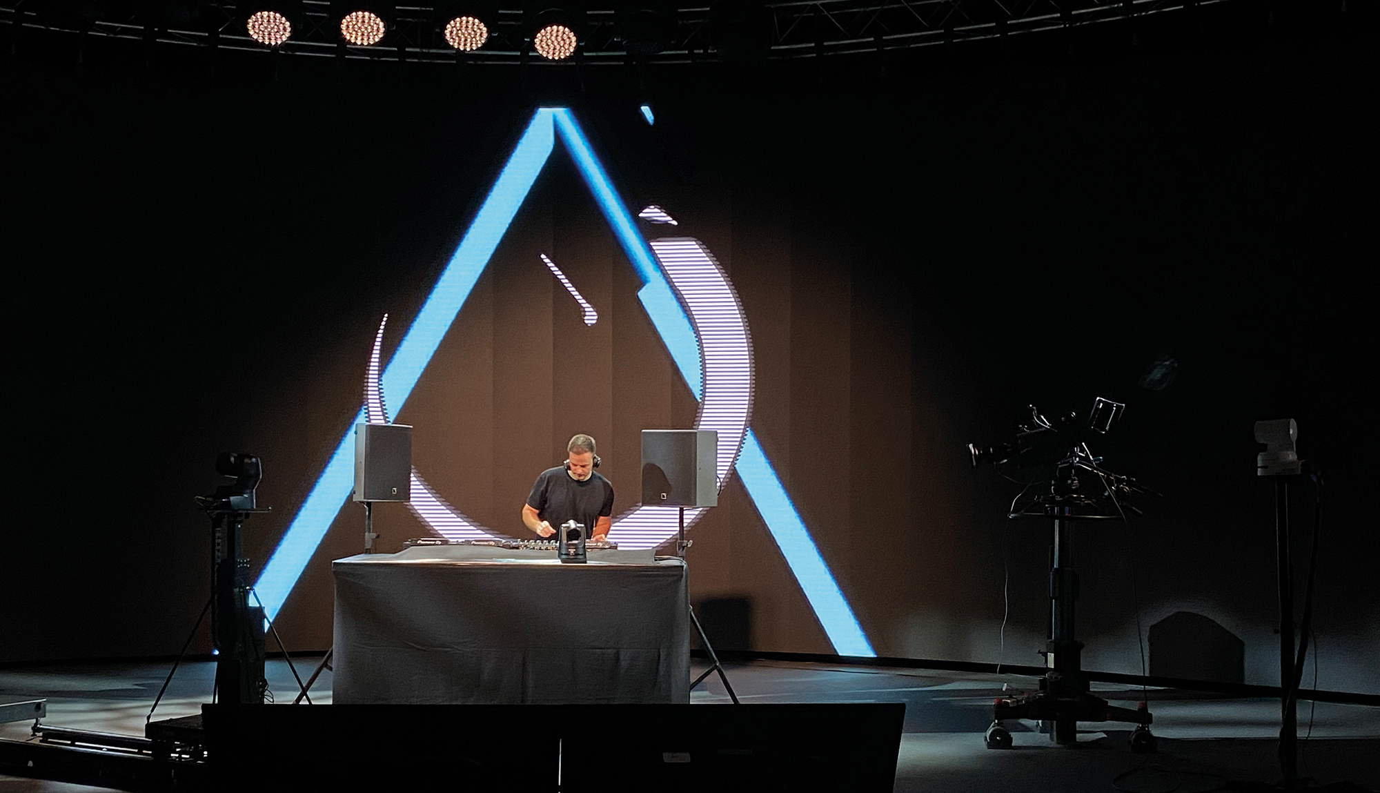 The production used five camera sources, shooting Yves V’s set against an LED backdrop. These were made up of two Panasonic AK-UC4000 studio cameras, with in-person, socially distanced operators. There was also an AW-UE100 for close-ups on the DJ deck, the AW-UE150 4K PTZ camera on a Panapod, and the AW-HE145 PTZ on a Tecnopoint rail and dolly.